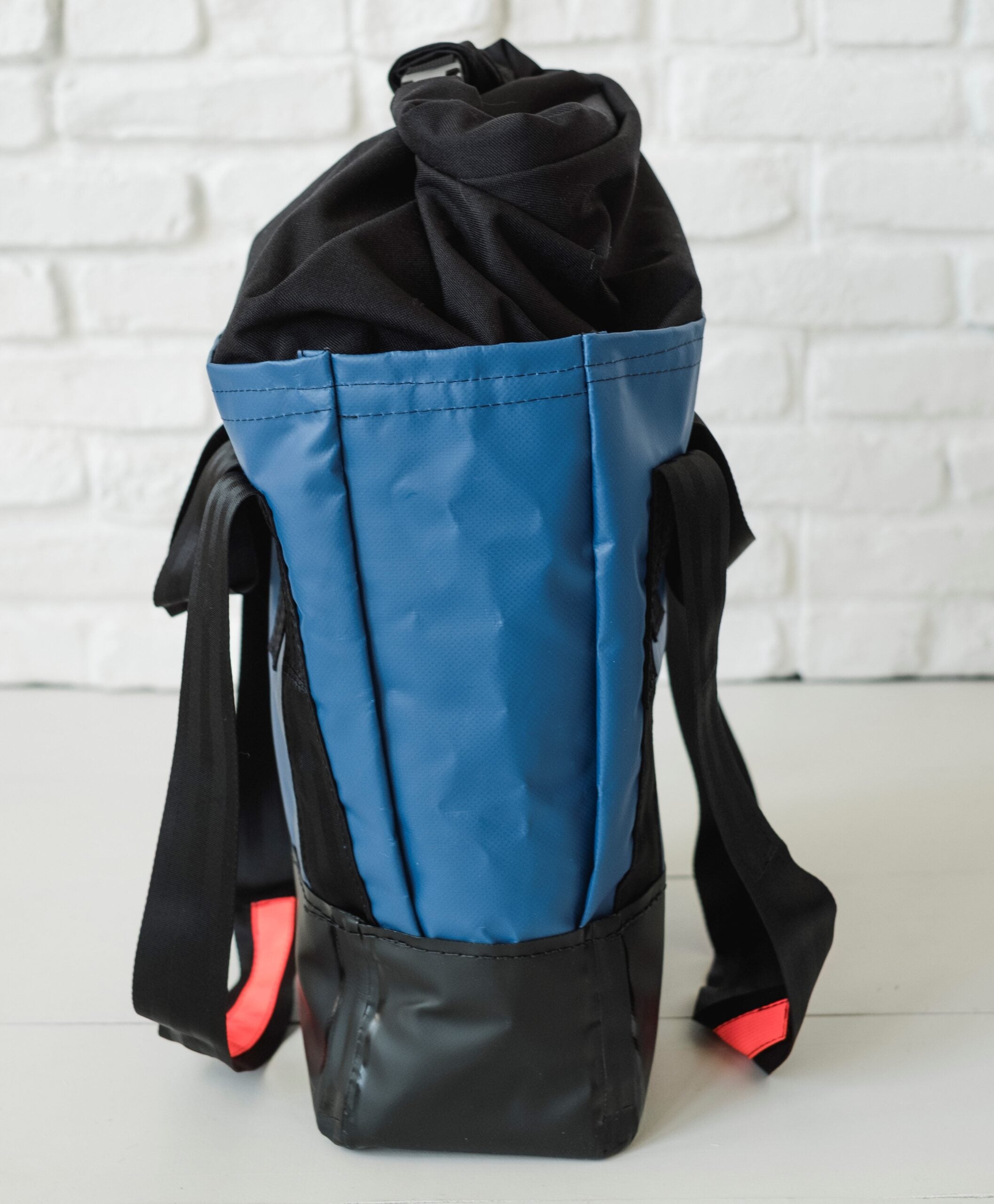 This load rated 100# compact lift tote is designed to carry a heavy load safely and securely. Heavy duty 18oz. Vinyl, double needle reinforced seams, and a dry-tight 1000d Nylon Cordura locking closure with two lift slings (marked in hi-viz orange) and HEAVY DUTY, waterproof vinyl base allow for ease of use and confidence in safety measures. Additional webbing grab handles allow for portability.