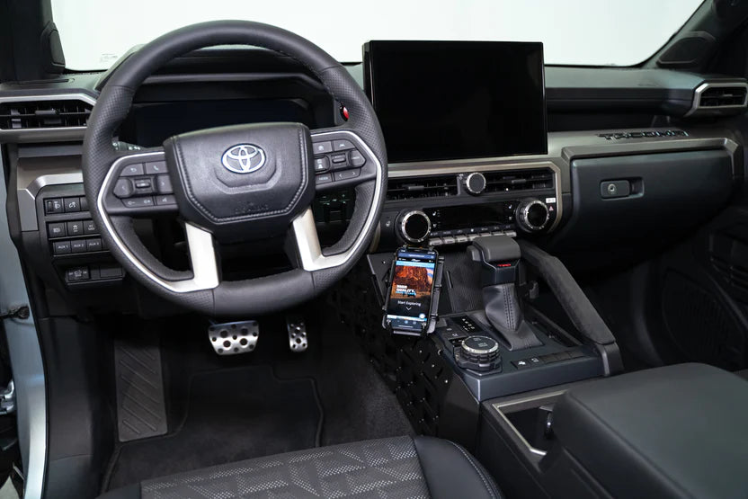 Our 4th Gen Toyota Tacoma Center Console Panels introduce diverse storage options to mount your daily gear within arm’s reach. Instead of stowing your things inside the glove box or center console, you can now securely mount it to the molle for quick and easy access. The dual panel design follows the Tacoma's body lines for a clean installation and streamlined look that retains full accessibility to handles, controls, charging station, and cup holders.